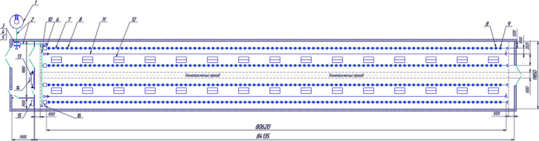 Комплект напольноrо оборудования включает - наружный силос приема и временного хранения сухих гранулированных и рассыпных комбикормов с транспортером подачи их в птичник, линии раздачи корма поголовью в птичнике спирально-трубчатыми кормораздатчиками с бункерными кормушкам, линии поения птицы из труб-водоводов с ниппельными (клапанными чашечными для индеек) поилками, системами обеспечения заданного микроклимата и освещения в птичнике.